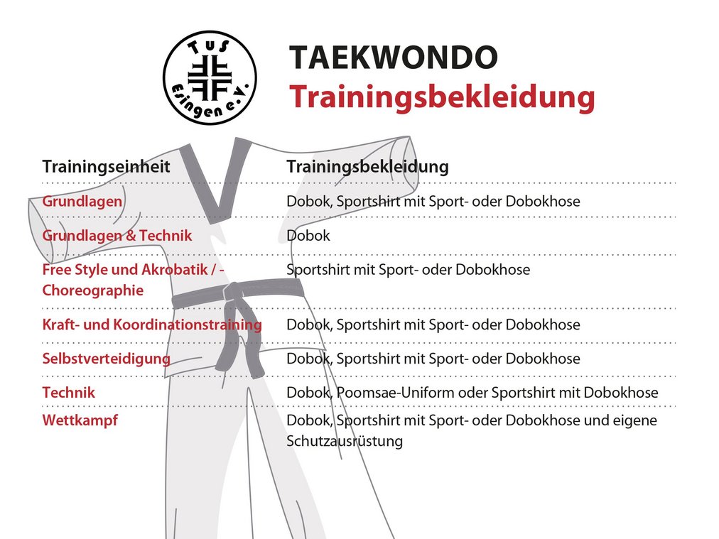 Trainingsbekleidung & GürtelGrundsätzlich wird Taekwondo im Dobok trainiert, wobei das „Do“ für den Weg steht und „bok“ Kleidung bedeutet. Der Taekwondo-Dobok ist weiß, welches geistige Reinheit symbolisiert. Getragen wird der Dobok mit einem der Graduierung entsprechenden Gürtel (Ty). Das Anziehen des Doboks steht auch für die klare Trennung zwischen Alltag und Training. Ferner ist vor dem Training jeglicher Schmuck abzulegen bzw. mit „Tape“ zu bedecken. Zum einen dient dies der Verletzungsprophylaxe und zum anderen werden die Sportler*innen hierdurch auf ihre Grundexistenz reduziert.