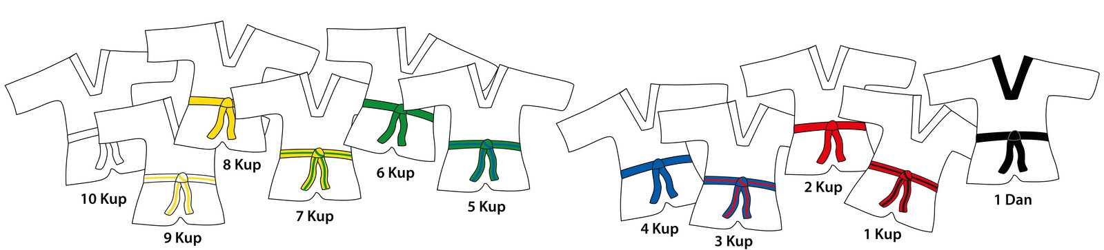 Die Farben der KupGürtel sind in der Reihenfolge weiß, gelb, grün, blau und rot angeordnet. Zwischen den Farben gibt es jeweils Übergangsfarben z.B weiß-gelb (9.Kup) usw. Die Gürtel der Dan-Grade sind alle Schwarz. Diese Farbe vereinigt alle anderen Farben in sich und ist das Gegenteil von weiß. Der erste Schwarzgurt ist der 1. Dan. Bis zum 3. Dan können die Prüfungen ebenfalls im Verein bzw. auf Landesebene abgelegt werden. Ab den 4. Dan bis zum 9. Dan erfolgt die Prüfung dann auf Bundesebene. Für den 10. Dan kann keine Prüfung abgelegt werden. Dieser wird nur ehrenhalber verliehen. Je länger der schwarze Gürtel getragen wird, desto mehr schimmert mit der Zeit durch Abnutzung das weiße Material unter dem schwarzen Stoff hervor. Dies wird auch oft als Rückkehr zur Unschuld des weißen Gürtels interpretiert: Es wurde ein Zyklus durchlaufen – man ist wieder am Anfang, hat aber eine neue Stufe des Wissens und des Bewußtseins erreicht.