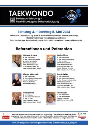 Endlich ist es soweit: Nach unserem großen Jubiläumslehrgang im vergangenen Jahr steht jetzt unser nächster Lehrgang an. Fokus ist das Thema realitätsbezogene Selbstverteidigung. Im Rahmen der Grundlagenausbildung kann jeder Teil einer Premiere für ganz Norddeutschland werden: Unser Lehrgang ist der erste in Norddeutschland, der den Teilnehmer*innen eine Einführung in das Taekwondo Defense (TKDD) anbietet. TKDD ist eine realistische, moderne Selbstverteidigung, die von Kampfsportler*innen ebenso wie von Polizei und Militär (zum Beispiel in Südkorea und Mexiko) trainiert und angewendet wird. Im Gegensatz zu anderen Selbstverteidigungsstilen nutzt TKDD gezielt Taekwondo-Techniken. TKDD kann aber auch ohne Taekwondo-Vorkenntnisse von Kampfsportler*innen anderer Stilrichtungen trainiert werden. Auf dem Programm für unseren Lehrgang stehen neben Basis- und Kombinationstechniken auch die Themen Messerbedrohung, Stockkampf und der Einsatz von Alltagsgegenständen in Selbstverteidigungssituationen. Im Bereich des Szenarientrainings bieten wir wegen der großen Nachfrage und vielen positiven Rückmeldungen nach unserem Jubiläumslehrgang im letzten Jahr noch einmal Selbstverteidigung im und am Linienbus und Auto vertieft an. Neu steht das Thema Selbstverteidigung bei Dunkelheit auf dem Programm.