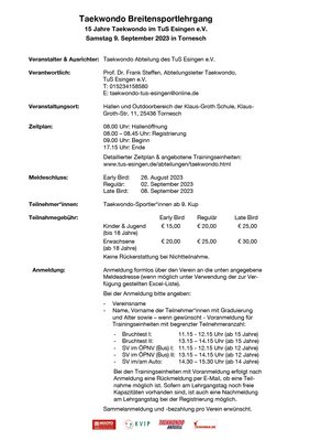 Vor 15 Jahren wurde die Taekwondo-Abteilung des TuS Esingen gegründet. Dies feiern wir am Sa., den 09. September 2023, mit einem großen Breitensportlehrgang mit Top-Referenten aus ganz Deutschland. In sechs Hallen und einem Outdoor-Bereich bieten wir insgesamt über 30 Trainingseinheiten aus den Bereichen Grundlagen, Poomsae, Wettkampf, Freestyle, Selbstverteidigung und Bruchtest an. Für Kinder gibt es ganztägig ein spezielles Programm zu den Themen Technik, Wettkampf, Selbstverteidigung und Formen. Im Outdoor-Bereich wird Selbstverteidigung im Linienbus und im/am Auto angeboten.
