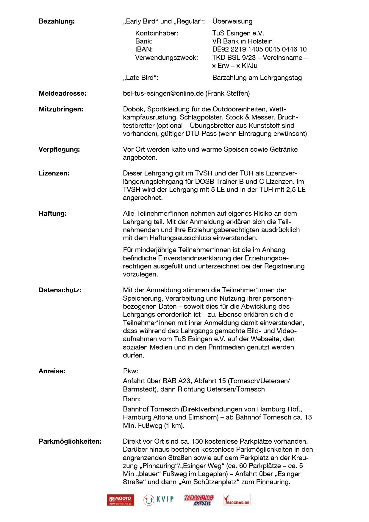 Weitere Informationen zum Lehrgang, wie Kosten- und Anmeldefristen, können der Ausschreibung entnommen werden, die hier zeitnah veröffentlicht wird. Hier schon einmal die Vorabankündigung des Lehrgangs sowie der vorläufige Zeitplan mit den geplanten Trainingseinheiten. Eine PDF-Version dieser Dateien ist unter Downloads zu finden.